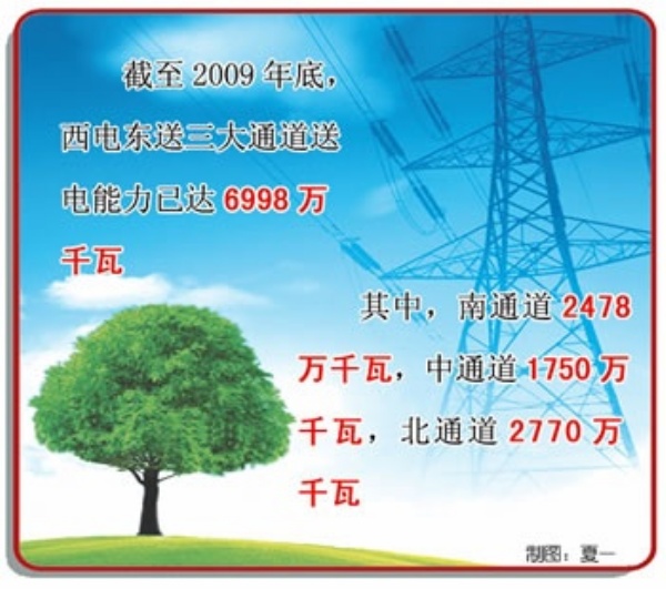 云广“特高压”是我国西电东送工程实施以来的一个缩影。通过这个国家重大工程,我国西部地区丰富的水能和煤炭资源,被转化为电力并送往东部。截至2009年底,西电东送3大通道送电能力已达6998万千瓦,其中,南通道2478万千瓦,中通道1750万千瓦,北通道2770万千瓦。