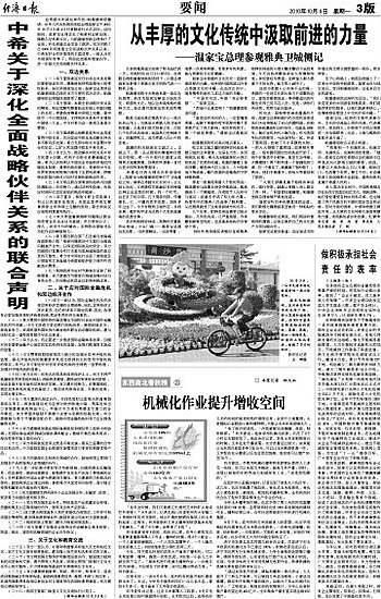 应希腊共和国总理乔治·帕潘德里欧邀请,中华人民共和国国务院总理温家宝于2010年10月2日至4日对希腊进行正式访问。访问期间,温家宝总理会见了帕普利亚斯总统、佩察尔尼科斯议长,与帕潘德里欧总理举行了会谈,并在希腊议会发表了演讲。双方回顾了自2006年两国建立全面战略伙伴关系以来,中希友好合作所取得的丰富成果,一致认为在当前国际形势下,两国应加强各领域合作,进一步深化全面战略伙伴关系。