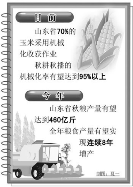 济宁市农委总农艺师黄九柏告诉记者,目前济宁市玉米收获的机械化水平已接近100%。秋粮收获完成以后,济宁市还将充分发挥机械优势,力争全面做到适期集中播种,确保冬前壮苗。山东省农业厅副厅长王培泉介绍说,目前,全省70%的玉米采用机械化收获作业,秋耕秋播的机械化率有望达到95%以上。