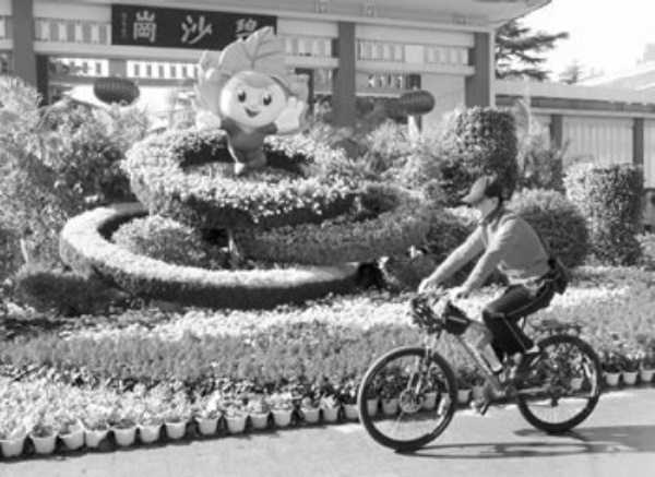 10月3日,一位市民骑车经过街道旁的一座立体花坛。 国庆长假期间,在河南省郑州市的休闲广场、街心花园和道路两旁,由500万盆各色鲜花组成的花坛、花廊、花圃,犹如一幅幅优美、和谐的立体风景画,扮靓了节日的郑州。 新华社记者 王 颂摄