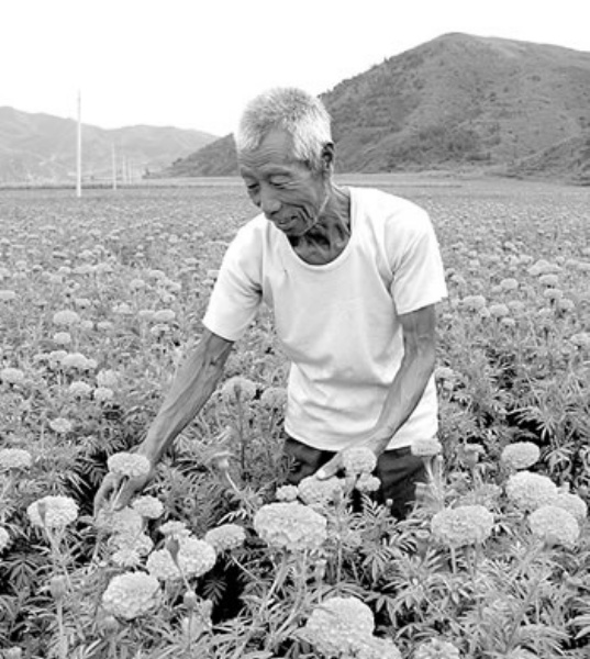 近年来,河北省赤城县立足县情,把发展旱作农业作为提升农业效益,增加农民收入的重要抓手,积极发展万寿菊产业,今年全县种植1万多亩,亩均增收500至800元。万寿菊成为该县农民增收致富的又一产业。图为农户在采摘成熟的花朵。 申贵飞摄