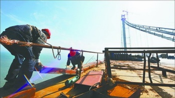 图6:建设中的青岛海湾大桥。大桥主体工程预计将于今年底完成,2011年建成通车。该桥的建成,将实现半岛城市群区域内各中心城市之间形成“四小时经济圈”的道路网络规划目标。