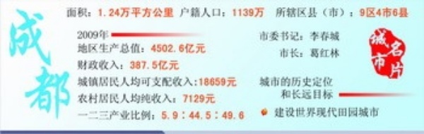 与2000年相比,2009年成都各类经济指标都实现了成倍增长。地区生产总值从1156.8亿元增至4502.6亿元,增长3.9倍;完成固定资产投资从475.9亿元增至4025.9亿元,增长8.5倍;规模以上工业增加值从207.7亿元增到1477.1亿元,增长6.1倍,年均增速达21%……