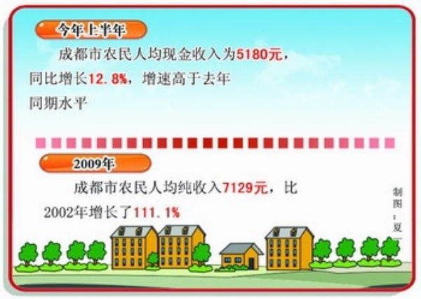正是由于成都在统筹城乡领域卓有成效的科学实验,在近年遭遇自然灾害和国际金融危机的不利影响下,全市农民收入仍然保持了持续向上的发展态势。2009年全市农民人均纯收入7129元,比2002年增长了111.1%。