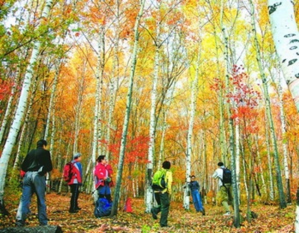 10月7日,游客在京郊喇叭沟门国家森林公园白桦林中游玩。 卜向东摄(新华社发)
