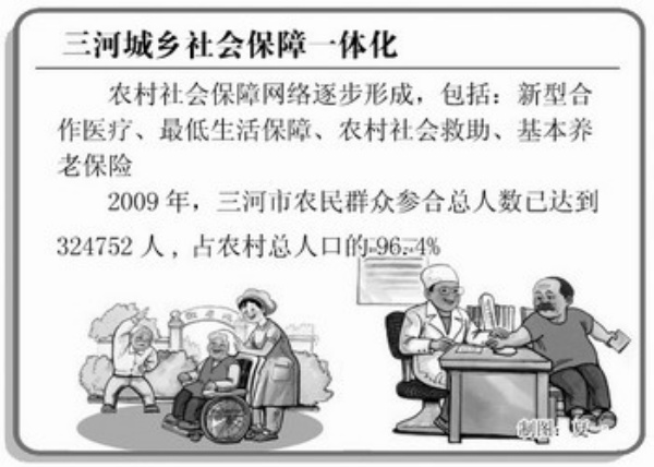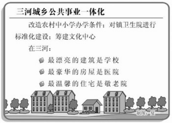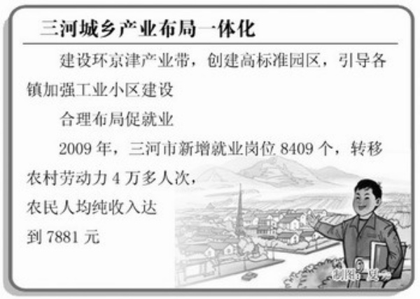 统筹城乡发展,重在建立和谐、协调的城乡关系。借助紧邻京津的优势,三河的城镇化步伐明显加快,逐步形成了以燕郊开发区和县城为核心的“哑铃形”城市格局,城市化率达到了54.5%,而且每年都在以1个百分点以上的速度递增。在实践中,我们正是借助了这种城镇化快速发展的势头,全面加大统筹城乡工作力度。具体突出抓了以下四点:一是抓规划。着眼于统筹城乡、科学布局、对接京津,树立“分片区发展、市域全覆盖、大区域联动”的理念,将全市643平方公里作为一个整体进行规划,建立了市区、园区、特色镇、新型社区、自然村落五级城乡体系。第二,抓建设。坚持多元开发,加大投入力度,城乡交通、水、电、暖、气、讯、管线等基础设施共建、公用、共享,统一布局、统一设计、统一建设,不断改善农村生产生活条件,缩小城乡差距。第三,抓发展。把城镇化、新农村建设和全民创业统筹结合,加强创业辅导,促进中小企业发展,有序引导农民向城镇转移;加快农村经济与城市经济对接,大力发展现代新型农业,培育农民专业合作经济组织,壮大龙头企业,提高农业产业化经营水平,促进农业增效、农民增收、农村发展。第四,抓民生。对照实现全面小康社会的目标,从群众最关心、最急需的事情入手,不断完善农村教育、医疗、科技、文体等设施,健全就业、社保等公共服务体系,着力打造城乡均等化的公共服务平台,让群众充分享受到发展的成果。