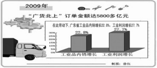 2009年,广东省委书记汪洋积极呼吁广货抓住机遇转型内销,吹响了“广货北上”的集结号。通过项目引导,广货一路北上、西行,参加了大大小小的展销会,一年订单金额高达5800多亿元。在此带动下,2009年广东全省工业品内销增长22.8%,工业利润增长27.7%,远超GDP增速,为“受寒”企业提供了“热能”,给“北上”、“西行”目的地的群众带去了实惠。