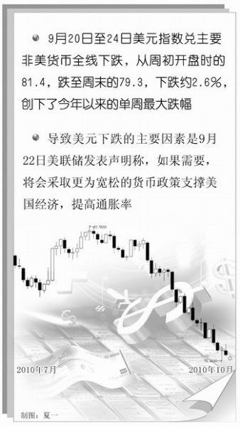 9月下旬美联储不止一次地表示:在必要时刻将会采取量化宽松政策,调整美元供给,以达到刺激经济的目的。而美国公布的一系列经济数据表现并不理想,市场担忧美联储进一步扩大量化宽松政策,因而在近期争相抛售美元,这也是美元持续走弱的原因。10月7日公布的美国一周初请失业金人数低于预估,稍微缓解了市场的担忧情绪,对美元形成支撑,但该消息并不能真正驱散市场对于量化宽松政策的预期,难以从根本上改变现状。