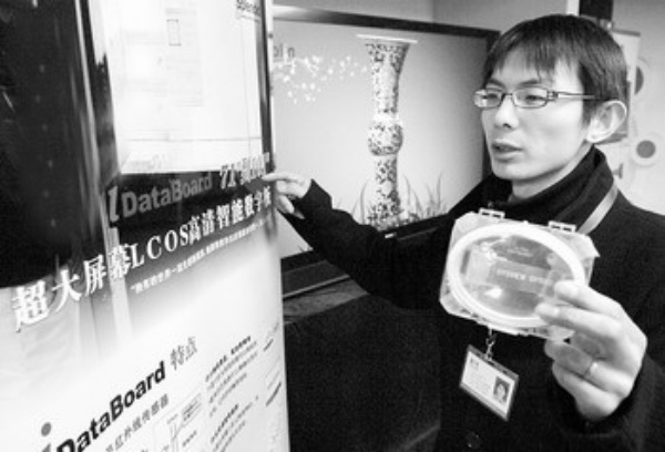 LCOS又称硅基液晶技术,是当今世界微显示领域的一种极具潜力的新型显示技术。与穿透式LCD(液晶显示器)和DLP(数字光处理)相比,LCOS具有利用光效率高、体积小、开口率高、制造技术较成熟等特点,它可以很容易实现高分辨率和充分的色彩表现;激光显示,则是继黑白显示、彩色显示、数字显示之后的新一代技术,室温寿命可达10万小时。武汉全真光电科技有限公司将LCOS与激光显示两大技术结合起来,研制出的71英寸全高清LCOS激光显示器,将使液晶显示器使用寿命成倍延长,且色彩显示更逼真。
