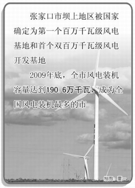 张家口市发改委副主任马海利介绍,坝上地区被国家确定为第一个百万千瓦级风电基地和首个双百万千瓦级风电开发基地。2009年底,全市风电装机容量达到190.6万千瓦,成为全国风电装机最多的市。