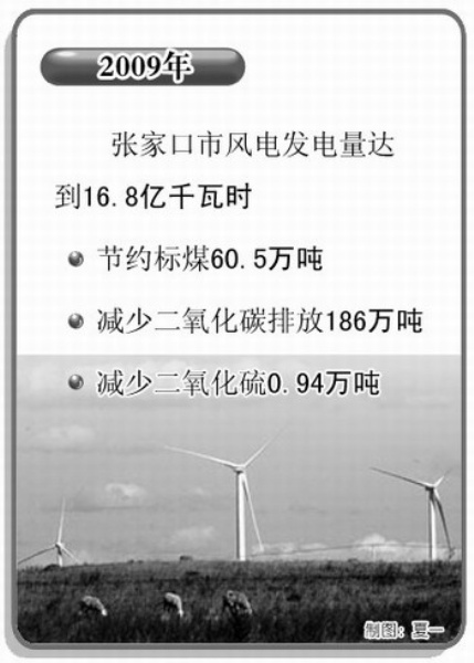 2009年,张家口市风电发电量达到16.8亿千瓦时,节约标煤60.5万吨、减少二氧化碳排放186万吨、减少二氧化硫0.94万吨。正在积极打造清洁能源城市的张家口市,为国家能源供应和节能减排做出重要贡献。