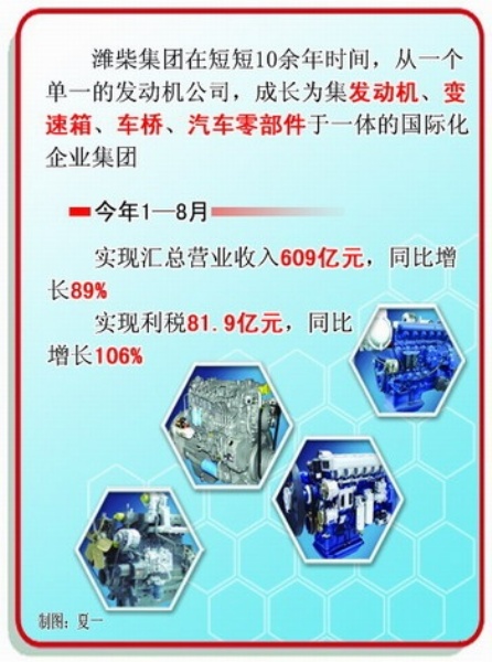 本报讯 记者单保江报道:山东重工潍柴集团积极转变发展方式,靠自主创新实现跨越式发展。短短10余年时间,从一个单一的发动机公司,成长为集发动机、变速箱、车桥、汽车零部件于一体的国际化企业集团。去年在国际金融危机的大背景下,企业汇总营业收入和利税分别增长6.4%和51%。今年1—8月,实现汇总营业收入609亿元,同比增长89%;实现利税81.9亿元,同比增长106%。其中,集团旗下上市公司潍柴动力上半年每股盈利达到3.88元,列国内所有上市公司第一位,发动机板块上半年全员劳动生产率达到人均118万元,超过国内同行业平均水平2倍以上。