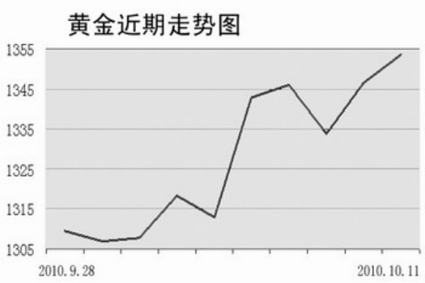上周美国公布其就业报告显示,9月份美国私营部门就业增加人数意外地低于预期1.1万人;另外,此前备受市场关注的美国非农就业数据也于上周公布,显示其9月非农就业人数减少9.5万人,已是连续第四个月下降,与预期持平,表明美国经济复苏势头仍然脆弱。这进一步强化了市场对美联储于11月初进一步放宽量化宽松政策的预期,美元指数随即下探至今年1月以来的最低点76.92,在此背景下,上周现货黄金、期金等均保持涨势:国际金价一度创下1364.60美元/盎司的历史新高,纽约期金12月合约也一度站上1351美元/盎司的历史高点。