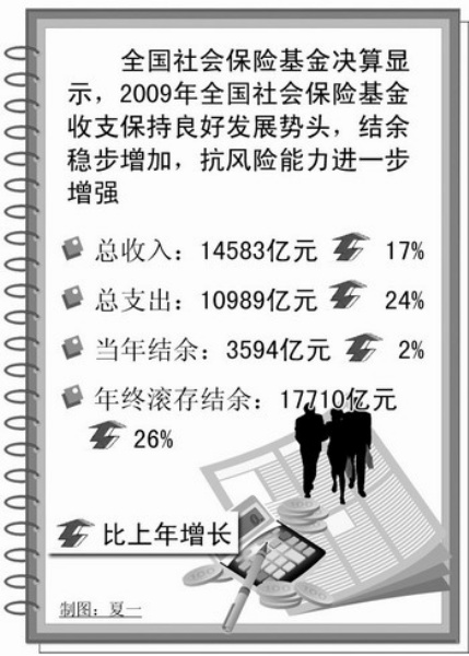 与此同时,社会保险基金结余增加,截至2009年底,全国5项基金滚存结余超过1.7万亿元,基金抗风险能力进一步增强。
