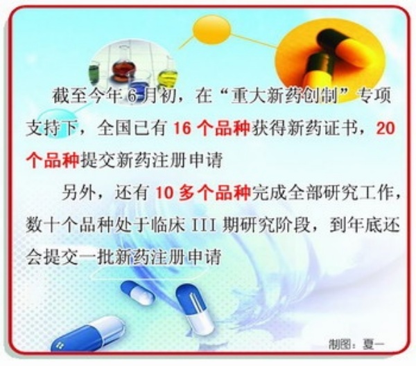 截至今年6月初,在“重大新药创制”专项支持下,全国已有16个品种获得新药证书,20个品种提交新药注册申请。另外,还有10多个品种完成全部研究工作,数十个品种处于临床III期研究阶段,到年底还会提交一批新药注册申请。部分新药研发的创新性和质量明显提升,已接近国际先进水平,其中近三分之二的新药是我国在世界上首次确定化学结构、作用靶点的一类新药。据不完全统计,目前有10个以上由我国自主研制的新药在发达国家进行临床试验,必将大大加速自主研制新药的国际化进程。