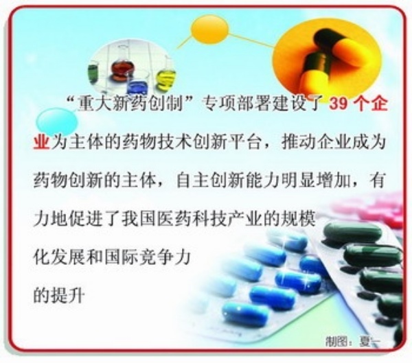 “重大新药创制”专项部署建设了39个企业为主体的药物技术创新平台,推动企业成为药物创新的主体,自主创新能力明显增强,有力地促进了我国医药科技产业的规模化发展和国际竞争力的提升。到“十二五”末,中国医药集团公司计划销售收入超过1000亿元,上海复兴药业集团公司、北京医药集团公司等近10家企业也提出了药品销售额超500亿元的目标。