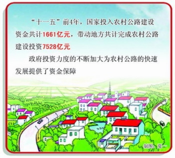 农村公路建设是推进社会主义新农村建设的重要内容,是构建便捷、通畅、高效、安全的交通运输体系的重要组成部分。农村公路是增加农民收入的有效途径,是扩大国内需求、拉动经济增长的重要措施。“十一五”前4年成为我国农村公路投资力度最大的时期。这4年,国家投入农村公路建设资金共计1661亿元,其中车购税资金1336亿元、国债资金325亿元,带动地方共计完成农村公路建设投资7528亿元。用于农村公路的车购税投资占车购税用于公路建设总投资的比例由2005年的29.5%提高到2009年的43.3%。政府投资力度的不断加大为农村公路的快速发展提供了资金保障。