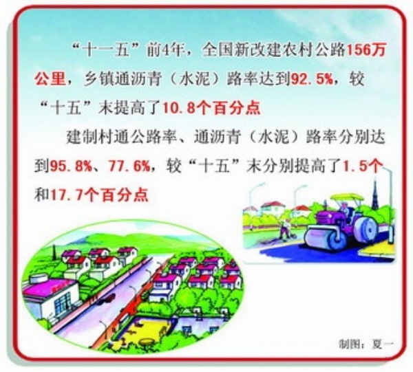 “十一五”以来,交通运输部和地方各级政府紧紧围绕全面建设小康社会和服务社会主义新农村建设这个大局,努力加快农村公路建设进程,农村公路通达水平和通畅程度大幅提高。“十一五”前4年,全国新改建农村公路156万公里(年均39万公里),乡镇通沥青(水泥)路率达到92.5%,较“十五”末提高了10.8个百分点;建制村通公路率、通沥青(水泥)路率分别达到95.8%、77.6%,较“十五”末分别提高了1.5个和17.7个百分点。
