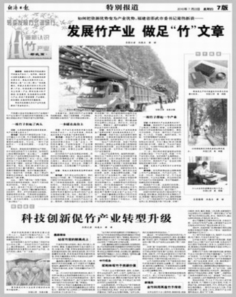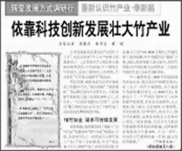 本报从7月8日至7月27日,以“篇版联动”的形式推出系列报道“转变发展方式调研行 重新认识竹产业”,这些报道倡导低碳理念,展示竹产业巨大的潜力和优势,让人们在喜闻乐见中开阔了视野,获得了新知识。该组报道引起社会各界广泛关注,一些读者来信发表感言。