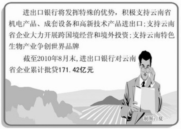 本报讯 记者赵晓强报道:10月11日,中国进出口银行云南省分行在昆明开业。在开业仪式上,中国进出口银行与云南省人民政府、中国进出口银行云南省分行与昆明市人民政府分别签署了《战略合作协议》。中国进出口银行云南省分行将结合云南区位条件、资源禀赋及经济结构特点,创新业务品种,优化信贷资源配置,重点支持当地有比较优势的企业“走出去”,促进云南开放型经济发展。