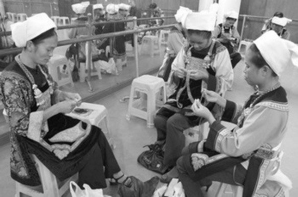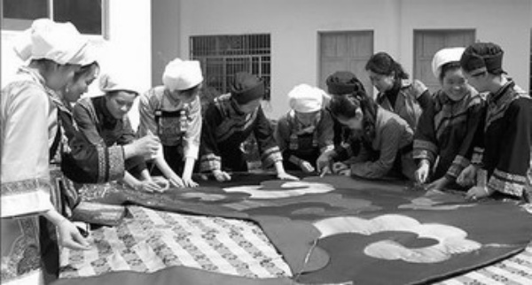 图4:妇女们为上海世博会一起制作马尾绣“祥云神虎”。