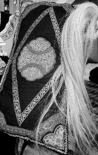 水族马尾绣是一门水族独有的传承千年的民间刺绣技艺,由聪明贤惠的水族妇女世代相传。其独特之处在于用丝线缠裹马尾进行刺绣,采用平绣、空心绣、挑绣、结线绣、螺形绣等针法,在水族土布上绣制,经过缠丝、勾线、补花、陪绣、订金等多道复杂工序,绣品呈现浅浮雕感。马尾绣工艺主要用于背带、翘尖绣花鞋、衣服、围腰、胸牌、童帽、荷包、刀鞘护套等的装饰上。而制作一件马尾绣背带,要花上整年时间才能完工。