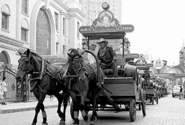 图1:具有哈尔滨城市特征的风情表演———“啤酒马车游”在中央大街举行。