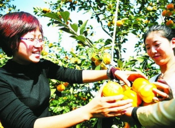 上图 游客在河北兴隆县眼石村一户农家中体验秋收的快乐。眼石村的乡村旅游办得红红火火,仅这一项村人均年收入就近万元。 本报记者 李树贵摄 左图 日前,首届狼牙山柿子节暨磨盘柿营销签约仪式在河北易县举行,满山红柿吸引了大批游客。林果业已成为易县农民致富增收的重要渠道。 许彦灵摄