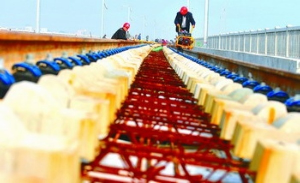 10月16日,工人正在石武铁路湖北段一处轨道上施工。 石武客运专线是京广客运专线的一部分,北接刚刚开工建设的京石客运专线,南连武广客运专线,三段客运专线相连,构成贯穿我国南北的高速铁路大动脉。石武客专正线长度840公里,设计最高运行时速将达350公里。由于高铁施工精度要求极高,而秋季的气温适中,正是施工的黄金季节,目前各建设单位正加紧施工建设。