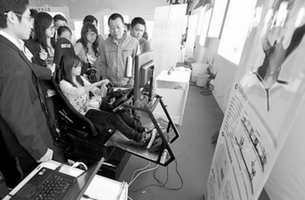 10月11日,参观者在科交会现场体验“赛车动态模拟器”。当日,2010中国长沙科技成果转化交易会开幕。新华社记者 赵众志摄