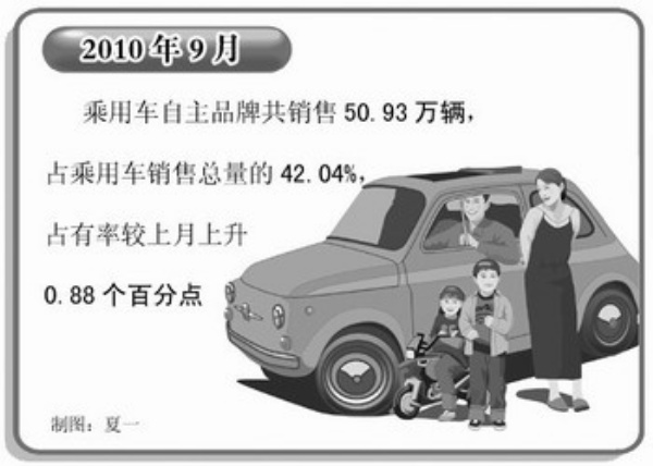 针对1.6升及以下排量乘用车,去年国家曾出台10%的购置税优惠政策,这让有很多产品覆盖1.6升及以下排量的自主品牌汽车企业受益明显。今年购置税优惠幅度降低弱化了政策的拉动效果,但三季度接连公布的“节能产品惠民工程”节能汽车推广目录再次强化了对小排量汽车销售的刺激作用,促使自主品牌乘用车市场份额继8月后继续回升。据统计,9月乘用车自主品牌共销售50.93万辆,占乘用车销售总量的42.04%,占有率较上月上升0.88个百分点。“9月28日,第三批节能汽车推广目录公布,在目录的自主品牌车型所占比例达6成以上,相信会有助于自主品牌汽车未来的销售。”颜景辉预测。