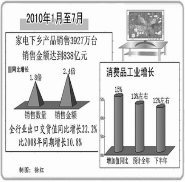从国内消费市场变动情况看,1至7月社会消费品零售总额同比增长18.2%,增速同比加快3.2个百分点,扣除价格因素,实际增幅与去年同期基本持平。家电下乡、以旧换新等鼓励消费政策效果继续显现,家电下乡产品销售3927万台,销售金额达到838亿元,同比分别增长1.8倍和2.4倍,主要家用电器产品产量快速回升。在外贸出口方面,1至7月消费品工业出口交货值同比增长22.2%,比2008年同期增长10.8%。