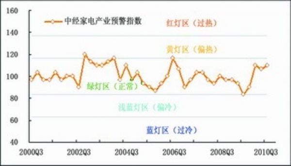 预警:2010年三季度,中经家电产业预警指数为110.0点,较上季度上升3.3点,仍运行于“绿灯区”中心线以上。