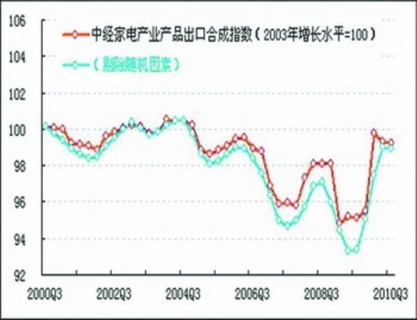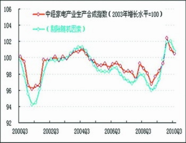 经测算剔除季节性因素后,本季度随机因素导致家电行业生产合成指数下降0.3个点,在进一步剔除随机因素后,家电行业生产合成指数比上季度亦有所回落(见图表中蓝色曲线)。