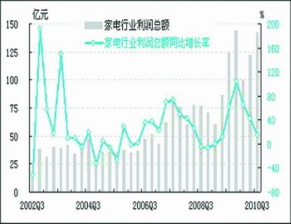 利润:2010年三季度,经初步季节调整,家电行业利润总额为142.6亿元,同比增长15.0%,增速较上季度回落26.3个百分点;环比增长16.6%,增速较上季度回落6.5个百分点。