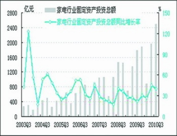 投资:2010年三季度,经初步季节调整,家电行业固定资产投资总额为2500.9亿元,同比增长40.0%,增速较上季度回落5.1个百分点;环比增长27.0%,增速较上季度回落97.2个百分点。