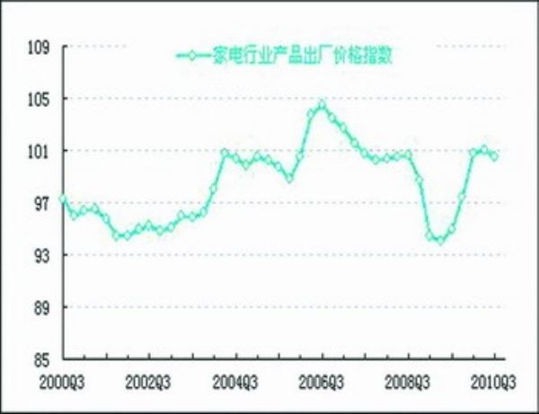 价格:2010年三季度,家电行业产品出厂价格同比上涨0.5%,与上季度相比微降0.5个百分点,基本保持平稳。在构成家电行业产品出厂价格指数的2个指标中,电气机械及器材制造业工业品出厂价格指数为102.1点,比上季度下降1.7个点;通信设备、计算机及其他电子设备制造业工业品出厂价格指数为99.0点,比上季度上升0.8个点。预计四季度家电产品出厂价格将保持相对稳定。
