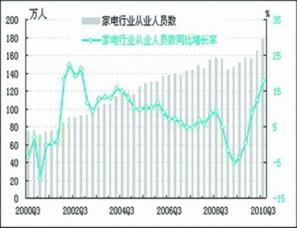用工:2010年三季度末,家电行业全部从业人员数为178.4万人,同比增长17.9%,较上季度提高5.4个百分点,目前已接近历史高点。预计四季度家电行业从业人员数将继续增加。