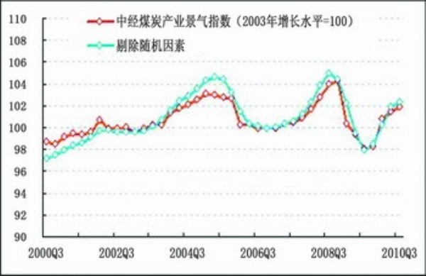 从中经煤炭产业景气指数走势图看,在进一步剔除随机因素后,中经煤炭产业景气指数的上升趋势较未剔除随机因素的景气指数上升趋势更加明显一些。这表明,三季度以来,相关调控政策对煤炭产业的景气度产生了一定的影响。
