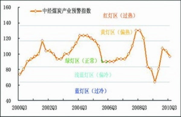 2010年三季度,中经煤炭产业景气指数为101.8点(2003年增长水平=100),较上季度上升0.4点。中经煤炭产业预警指数为96.7点,较上季度下降6.6点,仍处于“绿灯区”内运行。中经煤炭产业景气指数的变动表明煤炭产业延续了上季度平稳上升的态势,产业发展质量仍然处于持续改善之中。