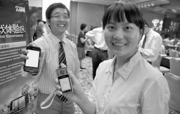图: 中国电信游戏中心日前成立,南京的用户正在体验智能手机游戏的互动功能。 新华社供图