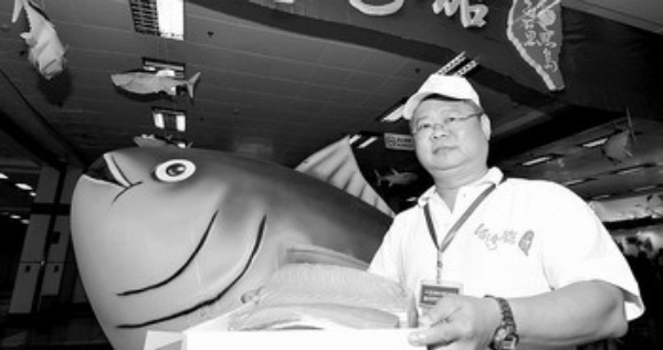 图1: 9月28日,在海峡渔业博览会台湾馆内,参展人员展示台湾特色水产鲔鱼的冷冻制品。 新华社记者 魏培全摄
