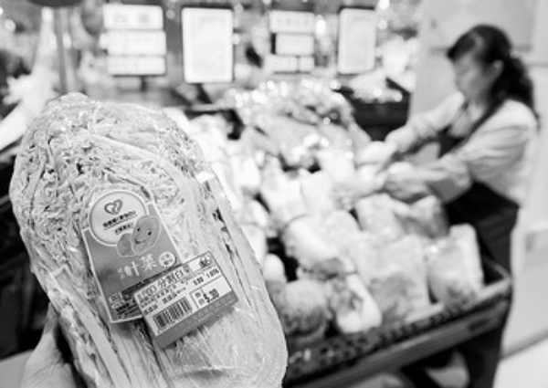 青岛一超市销售的蔬菜上标明了生产和加工环节的相关信息。(10月14日摄)。 新华社记者 李紫恒摄