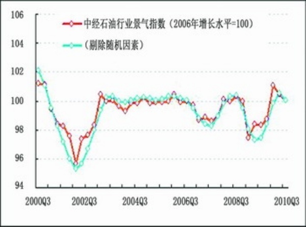 景气:2010年三季度,中经石油行业景气指数(仅剔除季节因素②,保留随机因素③)为100.0点(2006年增长水平=100④),较上季度略降0.5点⑤,呈回调整理态势。