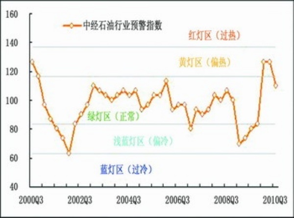 预警:2010年三季度,中经石油行业预警指数(仅剔除季节因素,保留随机因素)为110点,较上季度下降16.7点。在连续两个季度位于偏热的“黄灯区”后,中经石油行业预警指数本季度回落至正常的“绿灯区”。
