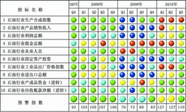 灯号:2010年三季度,反映经济运行所处冷热区域的中经石油行业预警灯号为绿色灯号,表明三季度石油行业总体经济运行处于正常稳定的区间。