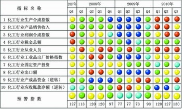 在构成中经化工行业预警指数的10个指标中,位于“绿灯区”的有1个指标————化工行业税金总额;位于“红灯区”的有4个指标————化工行业生产合成指数、化工行业利润合成指数、化工行业从业人员数和化工行业产成品资金占用(逆转);位于“黄灯区”的有3个指标————化工行业产品销售收入、化工行业产品出厂价格指数和化工行业出口额;位于“浅蓝灯区”的有2个指标————化工行业固定资产投资总额和化工行业应收账款净额。无指标位于“蓝灯区”。