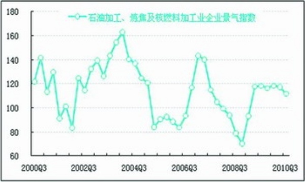 石油加工、炼焦及核燃料加工业企业景气指数为111.8点,较上季度下降5.6点。石油行业企业景气指数总体呈回落态势。