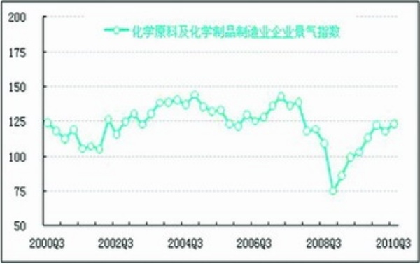 2010年三季度化学原料及化学制品制造业企业景气指数为123.4点,较上季度提高5.3点。企业景气状况的回升一定程度上受益于汽柴油价格下降带来的成本优势。