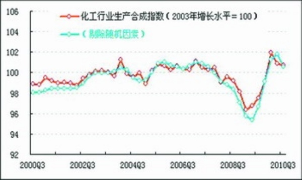 进一步剔除随机因素后,化工行业生产合成指数为100.5点(见化工行业生产合成指数走势图中蓝色曲线),略低于未剔除随机因素的生产合成指数。